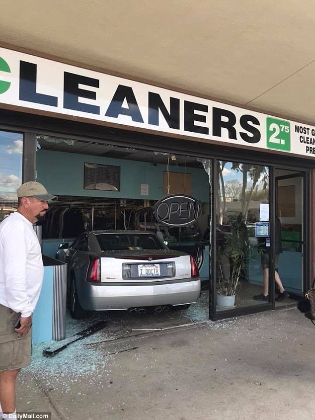 Elderly 'optometrist' with 'I DOCTR' license plate smashes through dry cleaners' glass store front, narrowly missing two people inside