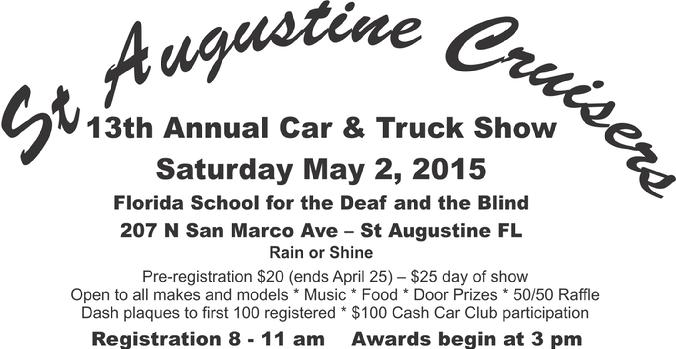 Throwing this out here for any florida area people Or anyone thinking of getting out of the cold and snow from the northern states. If you want to head up or down (depending on where you are from) to visit the historic city of st augustine. Then you are in for a cruisers dream. Come out and see the many cool rides of the st augustine cruisers. The show is at the same place where it has been for the past couple years. It's held on the shaded area of the st augustine school for deaf and blind right in the heart of old town st augustine.